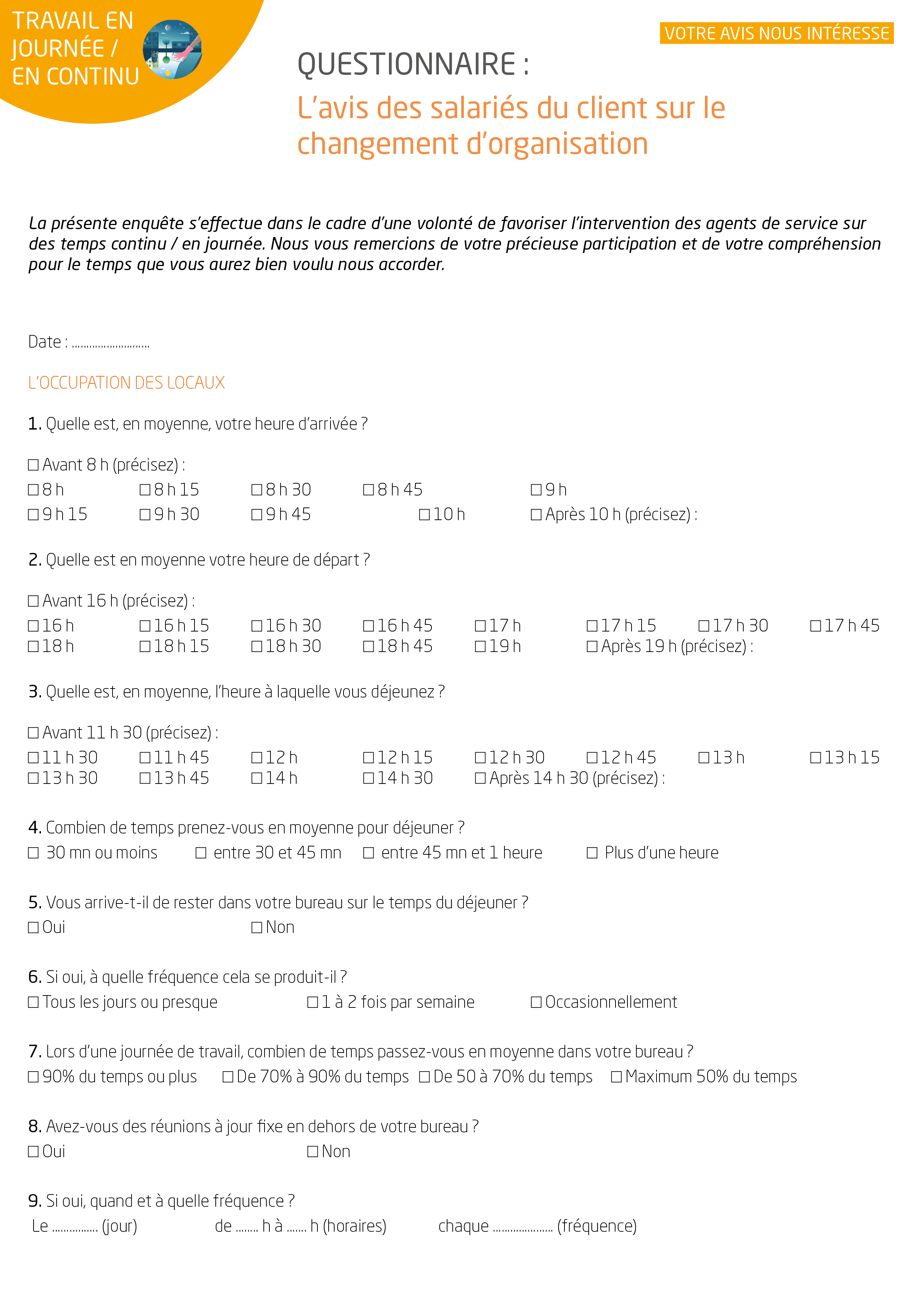 Le diagnostic est destiné à recueillir l'ensemble des informations nécessaires ou utiles de façon à préciser ensuite les modalités d'organisation de la prestation de propreté en continu / en journée.