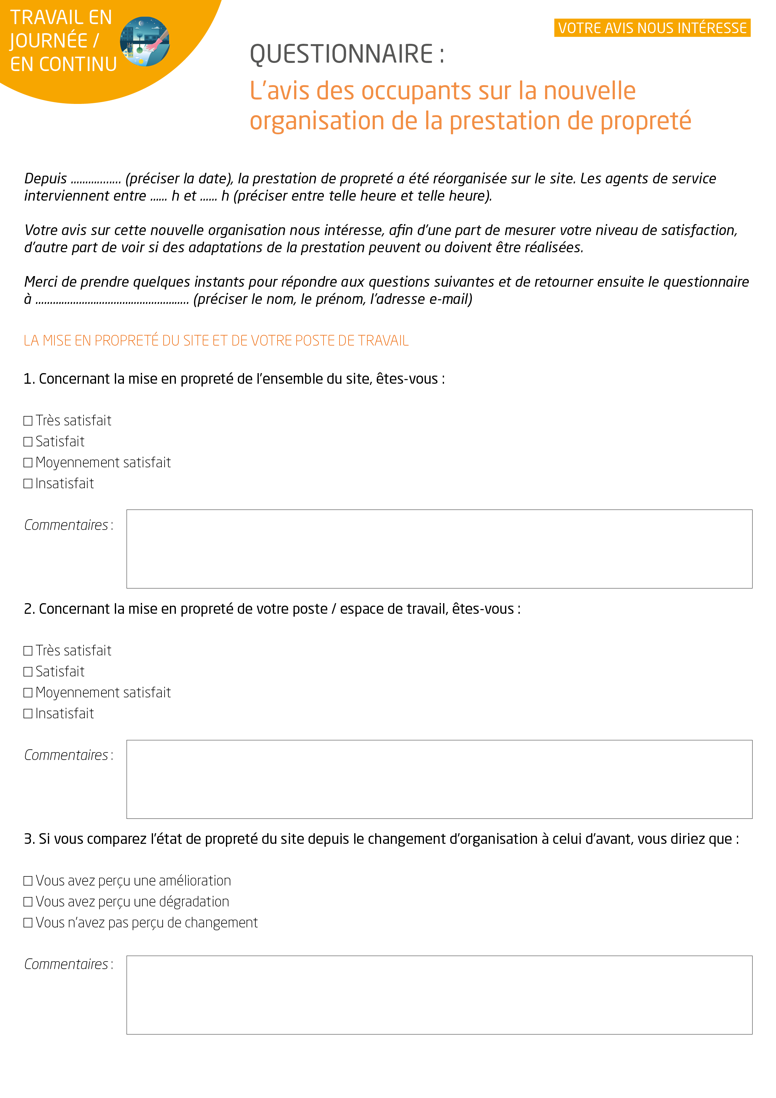 Un exemple de questionnaire à l'attention des occupants est aussi disponible, l'analyse des résultats obtenus permettra de faire ou non évoluer l'organisation mise en place.